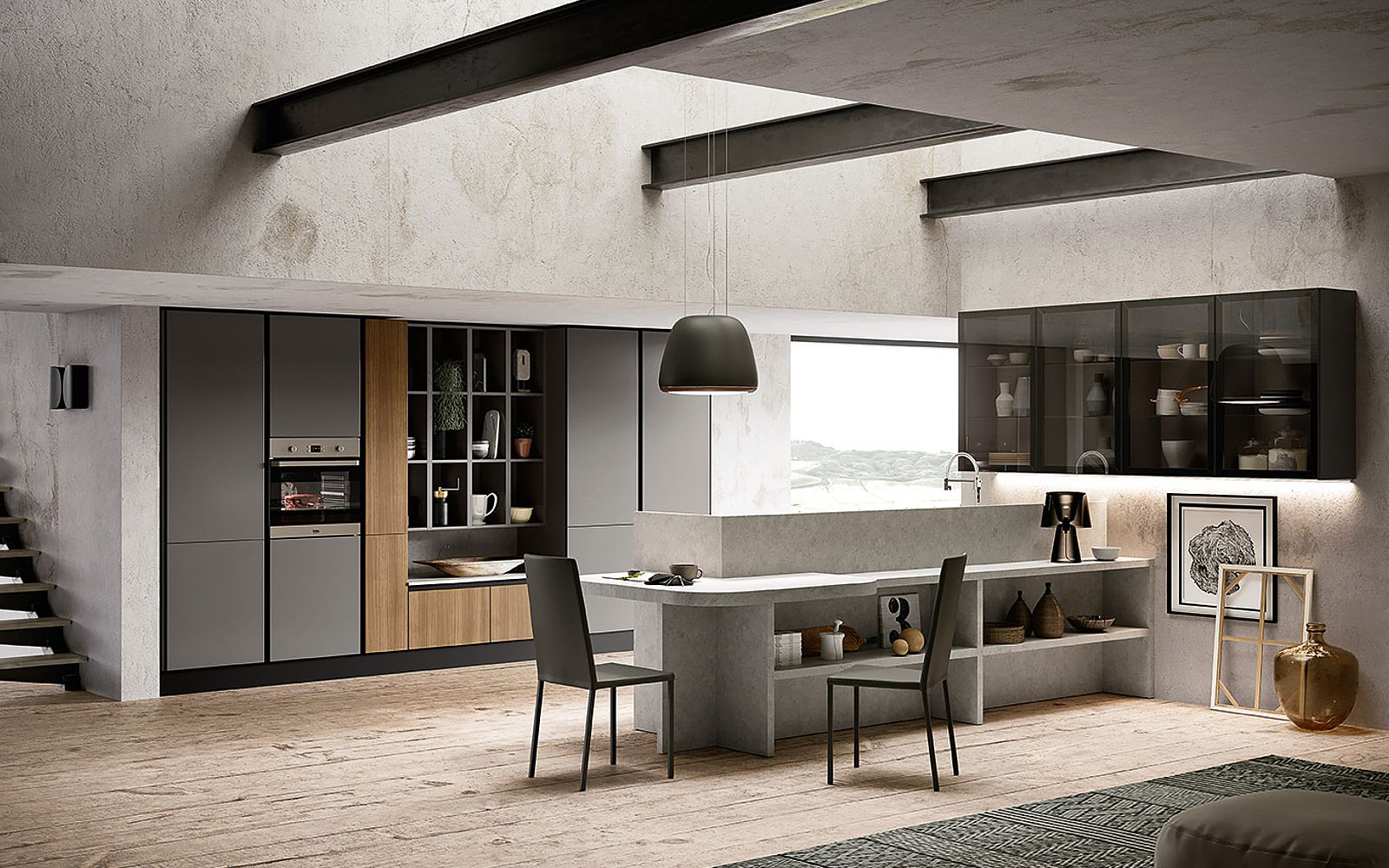 L’attualità delle soluzioni all-in-one di Paragon ti permette di arredare in continuità cucina e corner living adiacenti.